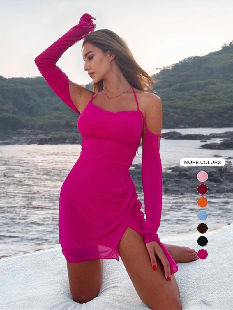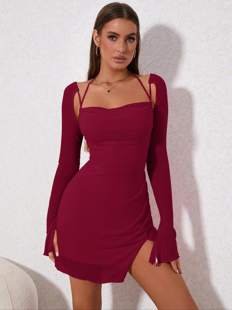 Women'S Long Sleeve Cowl Neck Tie Back Halter Split Bodycon Mini Dress, Back to School Outfits for Christmas, Valentine'S Day Contrast Mesh Flounce Sleeve Tight Short Dresses for Summer, Dresses for Party, Casual Wear, Holiday Bodycon Dress, Gift